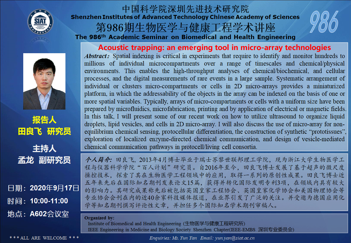 大家好!医工所将于2020年9月17日(周四)上午10:00-11:00,在A602会议室举办第986期生物医学与健康工程学术讲座,特邀 浙江大学 田良飞研究员 作题为“Acoustic trapping: an emerging tool in micro-array technologies”的学术报告。诚挚邀请大家参加学习和交流!