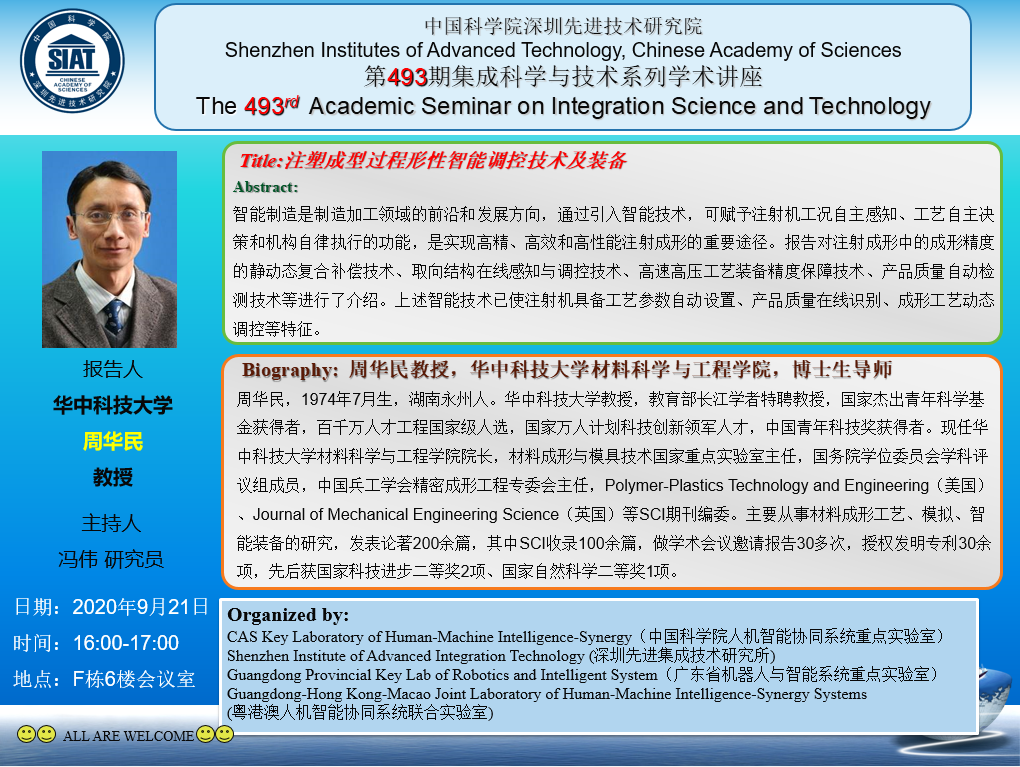 集成所第493期集成科学与技术系列学术讲座将于9月21日(今天)下午16:00~17:00在F栋6楼会议室召开。本次讲座特邀华中科技大学的周华民教授作题为《注塑成型过程形性智能调控技术及装备》的学术报告。