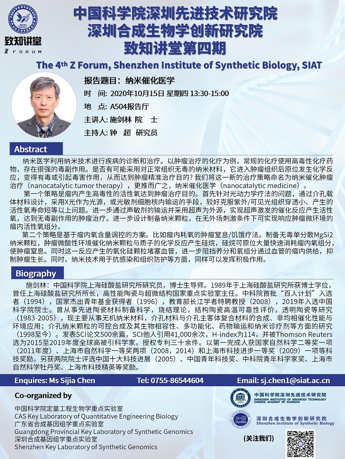合成生物学研究所/深圳合成生物学创新研究院“致知讲堂”第四期将于2020年10月15日(周四)13:30-15:00在A504报告厅进行。