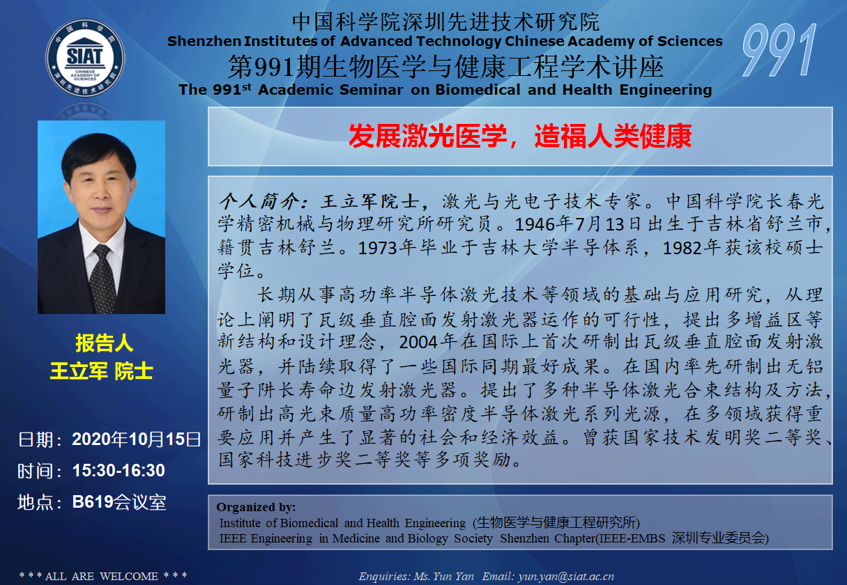 大家好!医工所将于2020年10月15日(周四)下午15:30-16:30,在B619会议室举办第991期生物医学与健康工程学术讲座,特邀 中国科学院长春光学精密机械与物理研究所 王立军院士 作题为“发展激光医学,造福人类健康”的学术报告。诚挚邀请大家参加学习和交流!