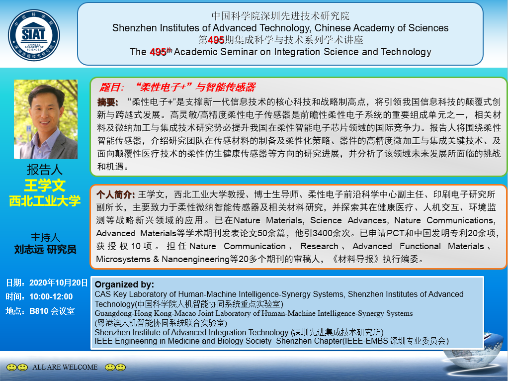 集成所第495期集成科学与技术系列学术讲座将于10月20日(周二)上午10:00-12:00在B810会议室召开。本次讲座特邀西北工业大学的王学文作题为《“柔性电子+”与智能传感器》的学术报告。