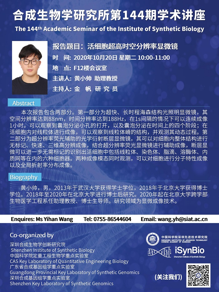 本次讲座邀请了 北京大学跨学部生物医学工程系 黄小帅 助理教授 带来“活细胞超高时空分辨率显微镜”的报告。