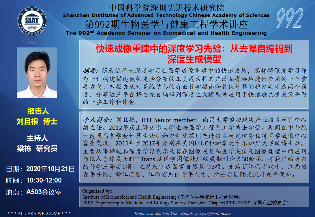 大家好!医工所将于2020年10月21日(周三)上午10:30-12:00,在A503会议室举办第992期生物医学与健康工程学术讲座,特邀 南昌大学虚拟现实产业技术研究中心 刘且根博士 作题为“快速成像重建中的深度学习先验:从去噪自编码到深度生成模型”的学术报告。诚挚邀请大家参加学习和交流!
