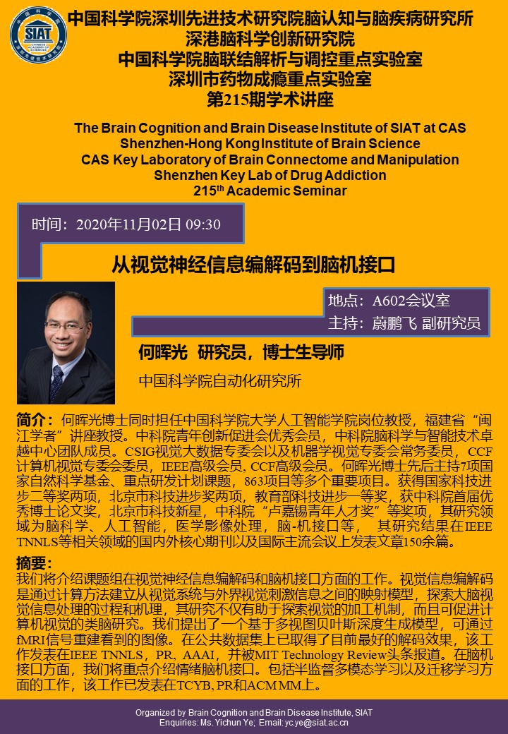 大家好!脑认知与脑疾病研究所将于2020年11月2日09:30,在A602会议室举办第二百一十五期学术讲座,