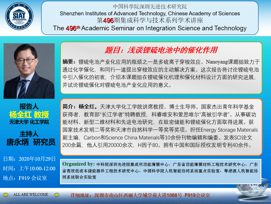 集成所第496期集成科学与技术系列学术讲座将于10月29日(周四)上午10:00-12:00在F919会议室召开。本次讲座特邀天津大学的杨全红教授作题为《浅谈锂硫电池中的催化作用》的学术报告。