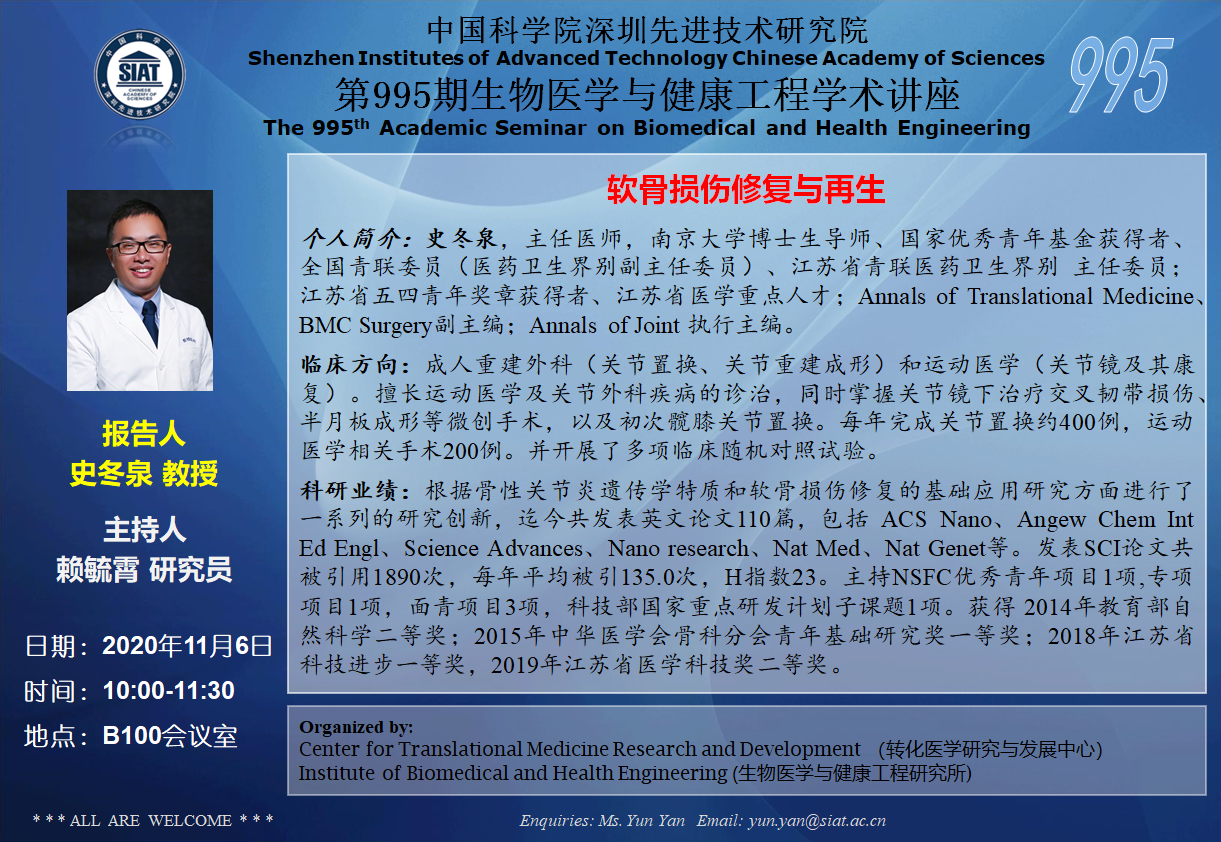 大家好!医工所将于2020年11月6日(周五)上午10:00-11:30,在B100会议室举办第995期生物医学与健康工程学术讲座,特邀 南京大学 史冬泉教授 作题为“软骨损伤修复与再生”的学术报告。诚挚邀请大家参加学习和交流!