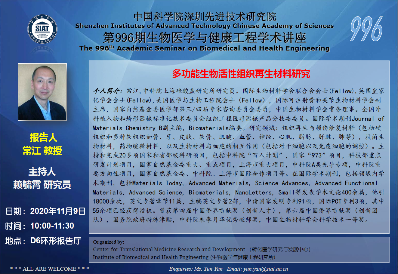 大家好!医工所将于2020年11月9日(周一)上午10:00-11:30,在D6环形报告厅举办第996期生物医学与健康工程学术讲座,特邀 中科院上海硅酸盐研究所 常江教授 作题为“多功能生物活性组织再生材料研究”的学术报告。诚挚邀请大家参加学习和交流!