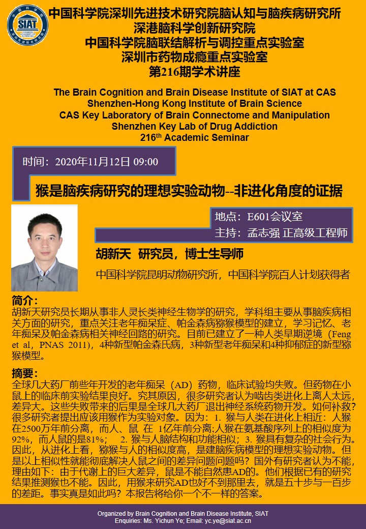 本次讲座由中国科学院昆明动物研究所,胡新天研究员做题为“猴是脑疾病研究的理想实验动物--非进化