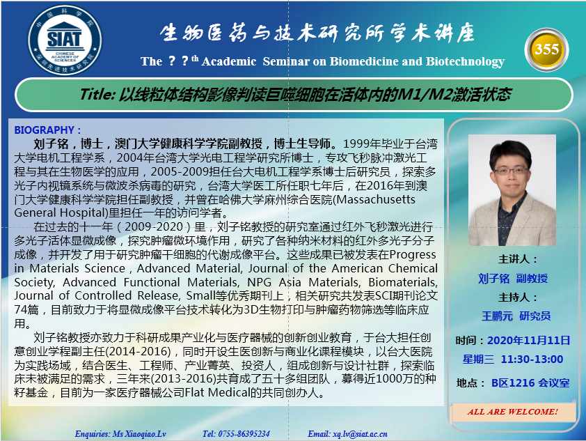 医药所第355期学术讲座将于2020年11月11日 星期三 11:30-13:00在先进院 B区1216会议室举行。本次讲座邀请了来自澳门大学健康科学学院副教授,刘子铭 博士带来“以线粒体结构影像判读巨噬细胞在活体内的M1/M2激活状态”的报告。届时,王鹏元 研究员将主持讲座。