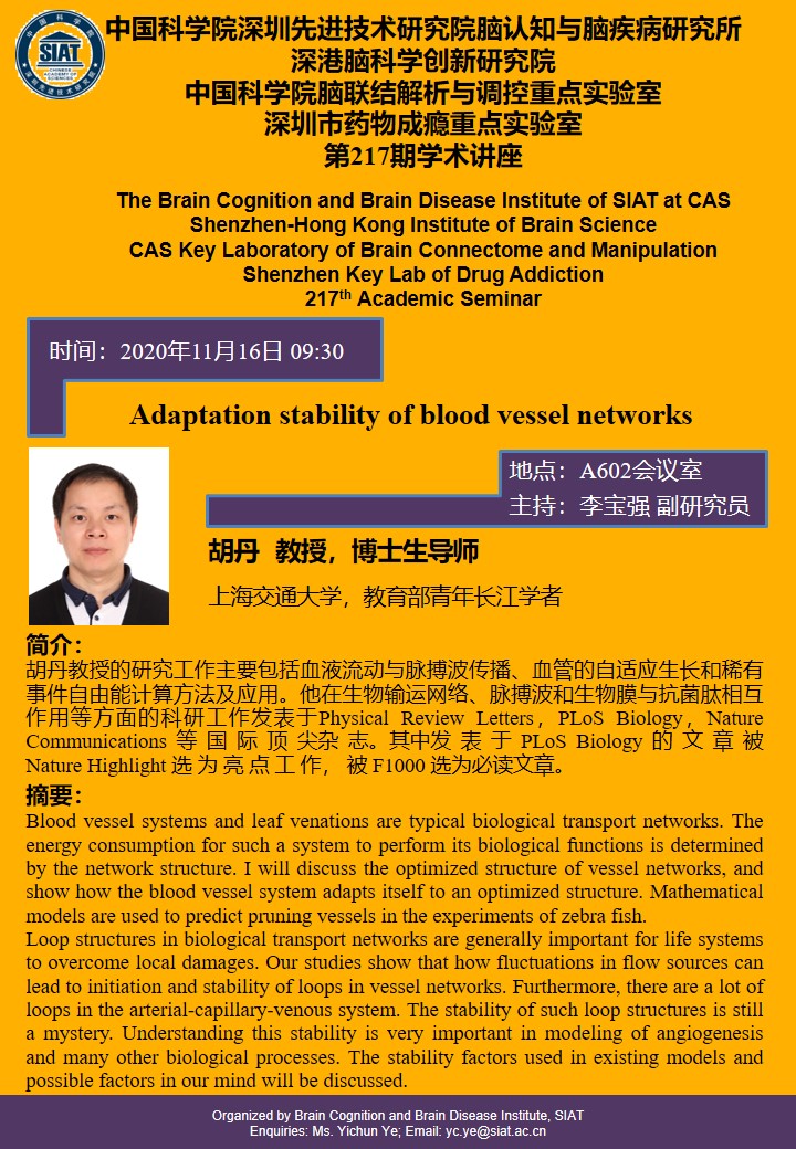 本次讲座由上海交通大学,胡丹教授做题为“Adaptation stability of blood vessel networks”的专题报告。