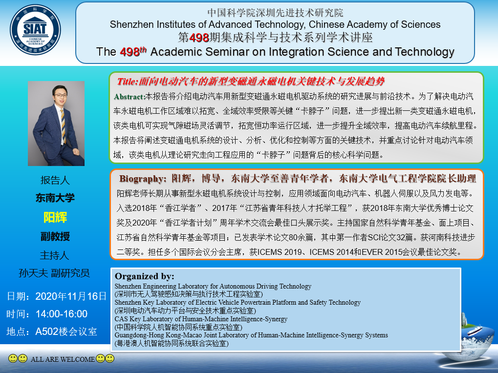 集成所第498期集成科学与技术系列学术讲座将于11月16日(周一)下午14:00-16:00在A502会议室召开。本次讲座特邀东南大学的阳辉副教授作题为《面向电动汽车的新型变磁通永磁电机关键技术与发展趋势》的学术报告。