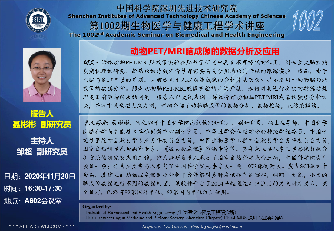 大家好!医工所将于2020年11月20日(周五)下午16:30-17:30,在A602会议室举办第1002期生物医学与健康工程学术讲座,特邀 中国科学院高能物理研究所 聂彬彬 副研究员 作题为“动物PET/MRI脑成像的数据分析及应用”的学术报告。诚挚邀请大家参加学习和交流!