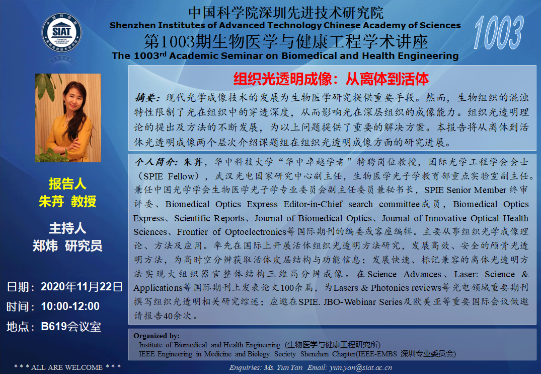 大家好!医工所将于2020年11月22日(周日)上午10:00-12:00,在B619会议室举办第1003期生物医学与健康工程学术讲座,特邀 华中科技大学 朱? 教授 作题为“组织光透明成像:从离体到活体”的学术报告。诚挚邀请大家参加学习和交流!