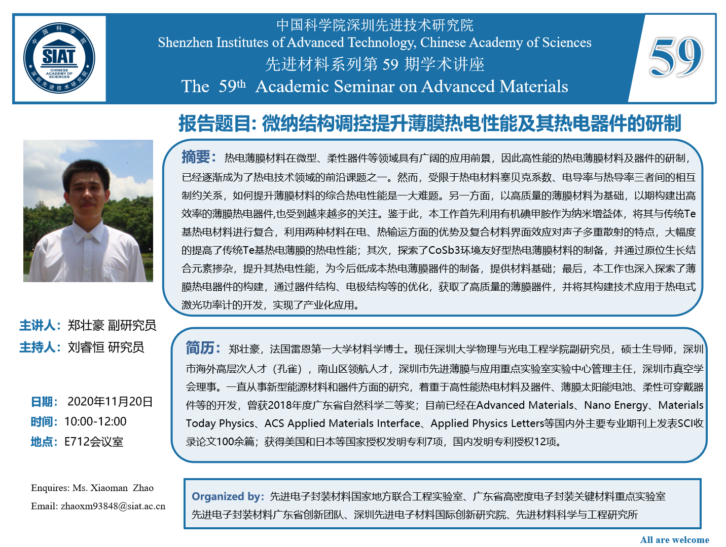 材料所(筹)第59期先进材料系列学术讲座将于11月20日(本周五)10:00-12:00在E712会议室召开。本次讲座特邀深圳大学物理与光电工程学院 郑壮豪 副研究员 作题为“微纳结构调控提升薄膜热电性能及其热电器件的研制”的学术报告。