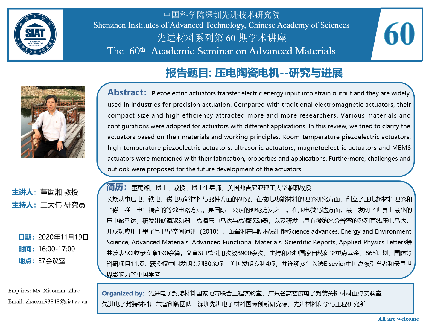 材料所(筹)第60期先进材料系列学术讲座将于11月19日(本周四)16:00-17:00在A502会议室召开。本次讲座特邀美国弗吉尼亚理工大学 董蜀湘 教授 作题为“压电陶瓷电机--研究与进展”的学术报告。