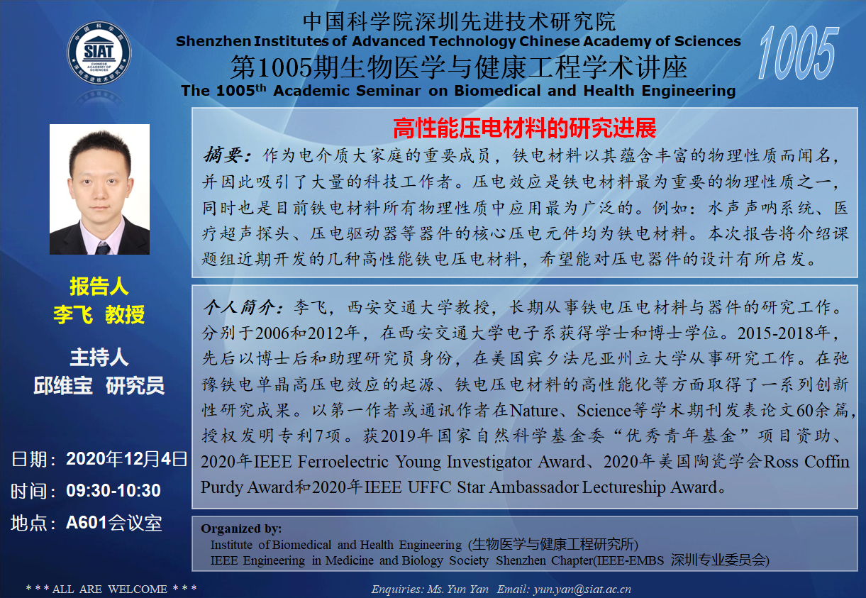 大家好!医工所将于2020年12月4日(周五)上午9:30-10:30,在A601会议室举办第1005期生物医学与健康工程学术讲座,特邀 西安交通大学 李飞教授 作题为“高性能压电材料的研究进展”的学术报告。诚挚邀请大家参加学习和交流!