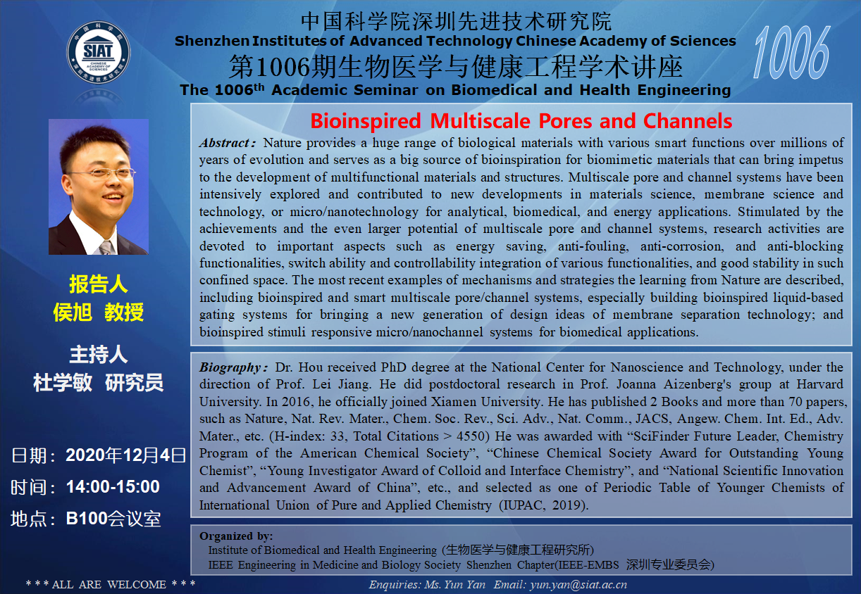 大家好!医工所将于2020年12月4日(周五)下午14:00-15:00,在B100会议室举办第1006期生物医学与健康工程学术讲座,特邀 厦门大学 侯旭教授 作题为“Bioinspired Multiscale Pores and Channels”的学术报告。诚挚邀请大家参加学习和交流!