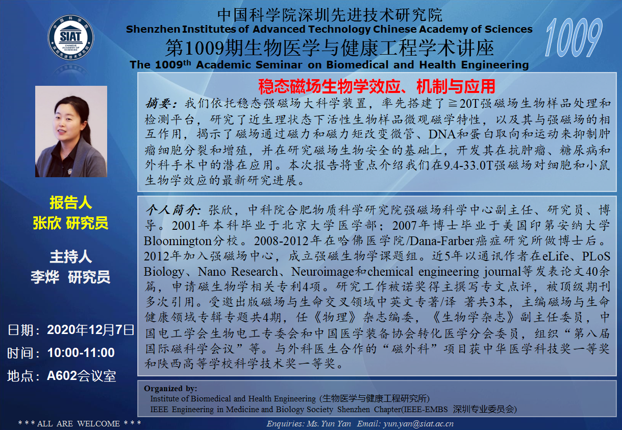 大家好!医工所将于2020年12月7日(周一)上午10:00-11:00,在A602会议室举办第1009期生物医学与健康工程学术讲座,特邀 中科院合肥物质科学研究院 张欣 研究员 作题为“稳态磁场生物学效应、机制与应用”的学术报告。诚挚邀请大家参加学习和交流!