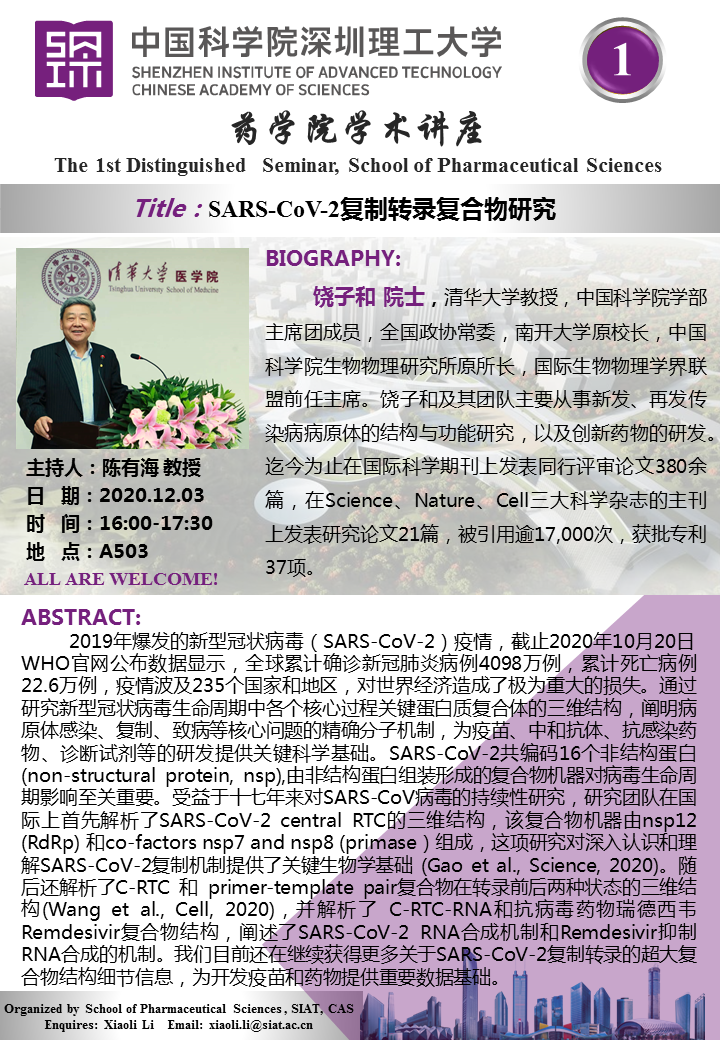 深理工药学院第1期学术讲座来啦!药学院第1期学术讲座将于2020年12月03日 星期四 16:00-17:30在先进院 A503会议室举行。本次讲座邀请了来自清华大学医学院,饶子和 院士带来“SARS-CoV-2复制转录复合物研究”的报告。届时,陈有海 教授将主持讲座。