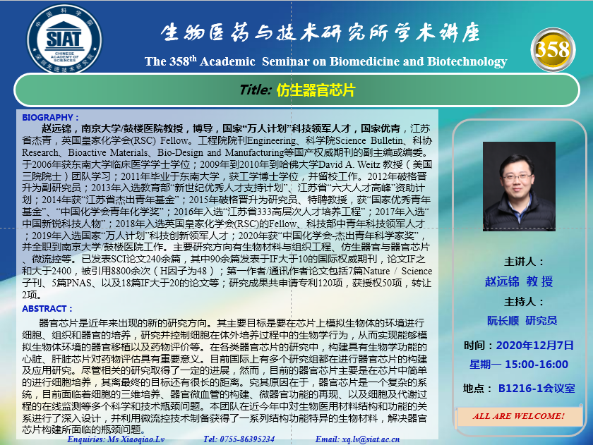 医药所第358期学术讲座将于2020年12月7日 星期一 15:00-16:00在先进院 B1216-1会议室举行。本次讲座邀请了来自南京大学/鼓楼医院,赵远锦 教授带来“仿生器官芯片”的报告。届时,阮长顺 研究员将主持讲座。