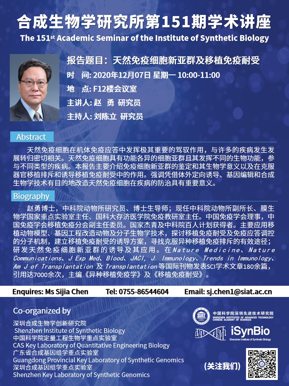 本次讲座邀请了 中国科学院动物研究所 赵勇 研究员 带来题为“天然免疫细胞新亚群及移植免疫耐受”的报告。
