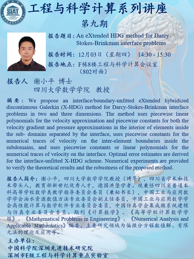 大家好!数字所工程与科学计算系列讲座第九期将于12月3日 14:30-15:30在F栋8楼会议室(802对面)举行,本次讲座将邀请四川大学 谢小平 教授作题为“An eXtended HDG method for Darcy-Stokes-Brinkman interface problems”的报告。诚挚邀请大家参加、学习和交流!