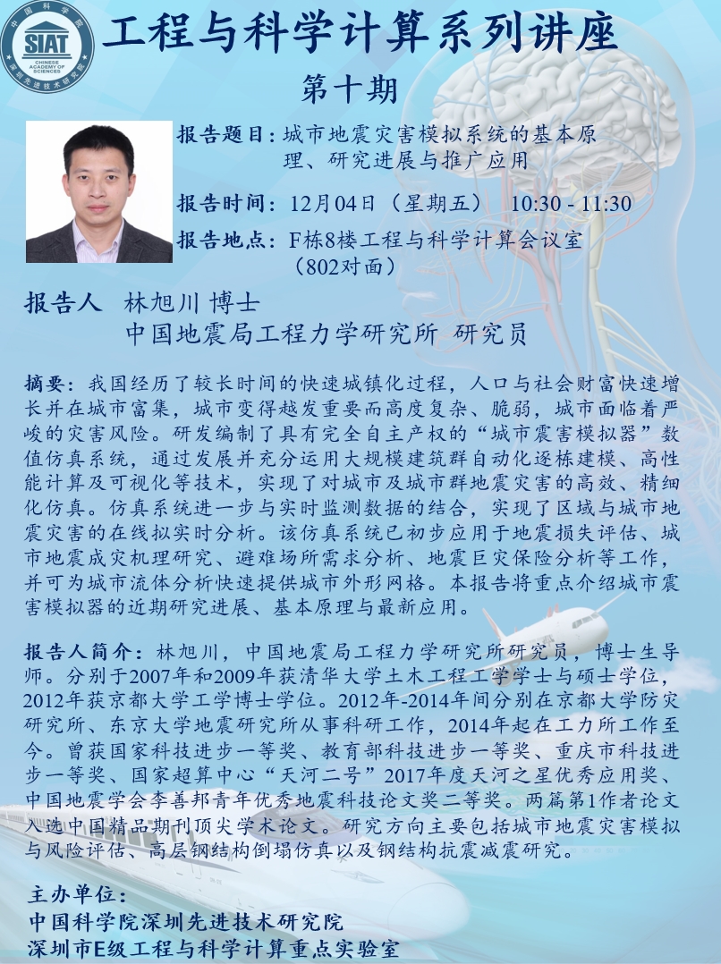 大家好!数字所工程与科学计算系列讲座第十期将于12月4日 10:30-11:30在F栋8楼会议室(802对面)举行,本次讲座将邀请中国地震局工程力学研究所 林旭川 研究员作题为“城市地震灾害模拟系统的基本原理、研究进展与推广应用”的报告。诚挚邀请大家参加、学习和交流!