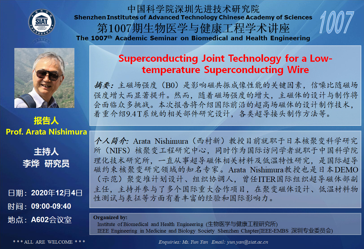 大家好!医工所将于2020年12月4日(周五)上午09:00-09:40,在A602会议室举办第1007期生物医学与健康工程学术讲座,特邀 日本核聚变科学研究所 Prof. Arata Nishimura 作题为“Superconducting Joint Technology for a Low-temperature Superconducting Wire”的学术报告。诚挚邀请大家参加学习和交流!