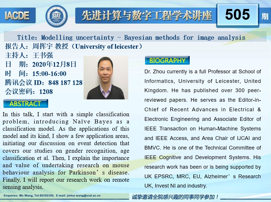 大家好!先进计算与数字工程学术讲座第505期将于12月8日 15:00-16:00在腾讯会议端举行(会议ID:848 187 128,会议密码1208),本次讲座将邀请英国莱斯特大学 周挥宇 教授作题为“Modelling uncertainty - Bayesian methods for image analysis”的报告。本次报告将由数字所王书强 副研究员主持,诚挚邀请大家参加、学习和交流!