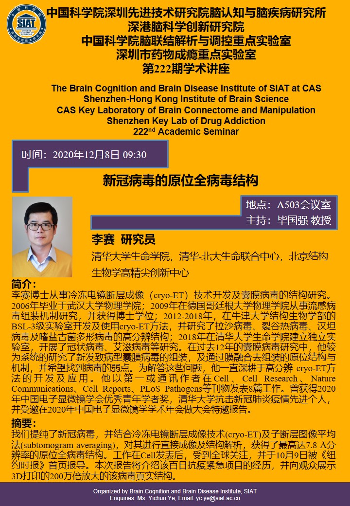 本次讲座由清华大学生命科学学院,李赛研究员做题为“新冠病毒的原位全病毒结构”的 专题报告。