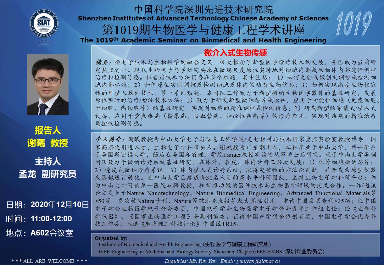 大家好!医工所将于2020年12月10日(周四)上午11:00-12:00,在A602会议室举办第1019期生物医学与健康工程学术讲座,特邀 中山大学 谢曦教授 作题为“微介入式生物传感”的学术报告。诚挚邀请大家参加学习和交流!