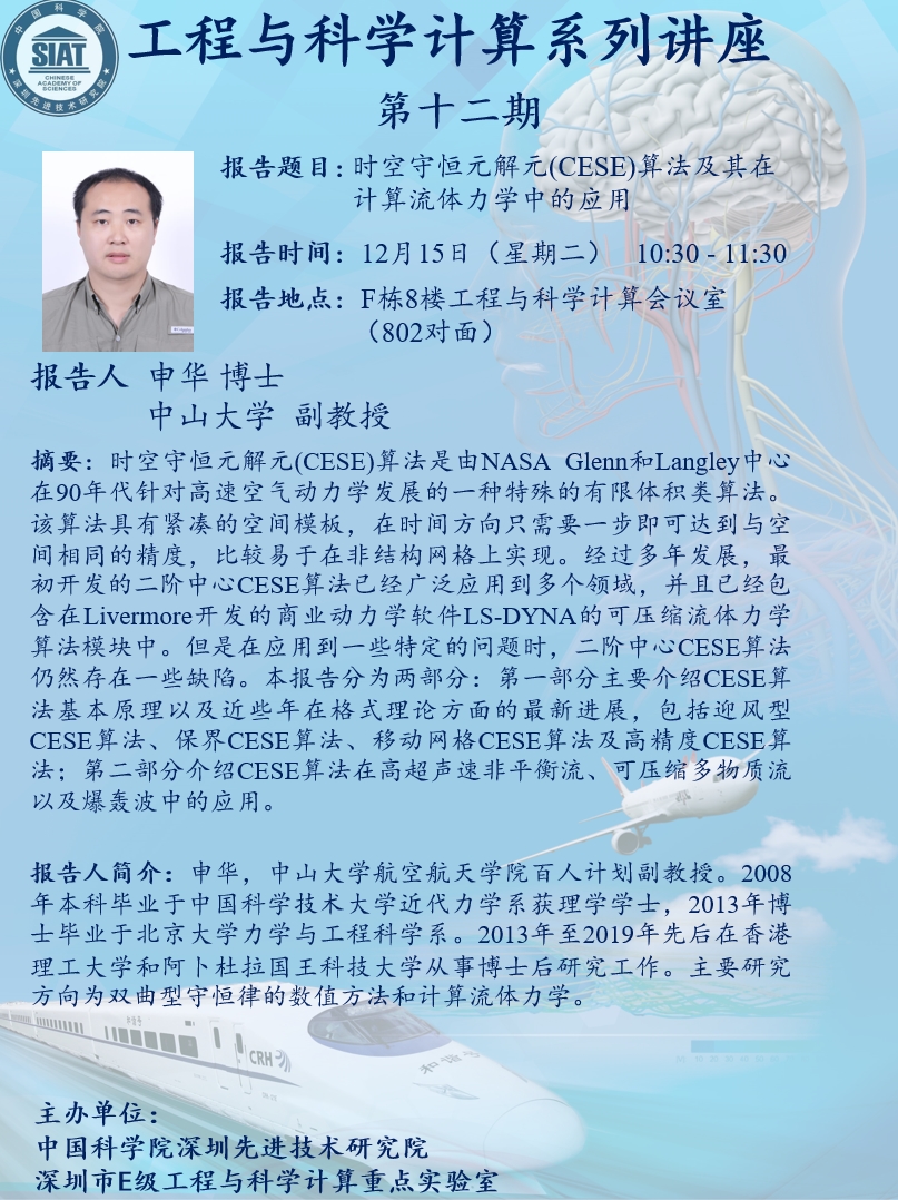 大家好!数字所工程与科学计算系列讲座第十二期将于12月15日 10:30-11:30在F栋8楼会议室(802对面)举行,本次讲座将邀请中山大学 申华 副教授作题为“时空守恒元解元(CESE)算法及其在计算流体力学中的应用”的报告。诚挚邀请大家参加、学习和交流!