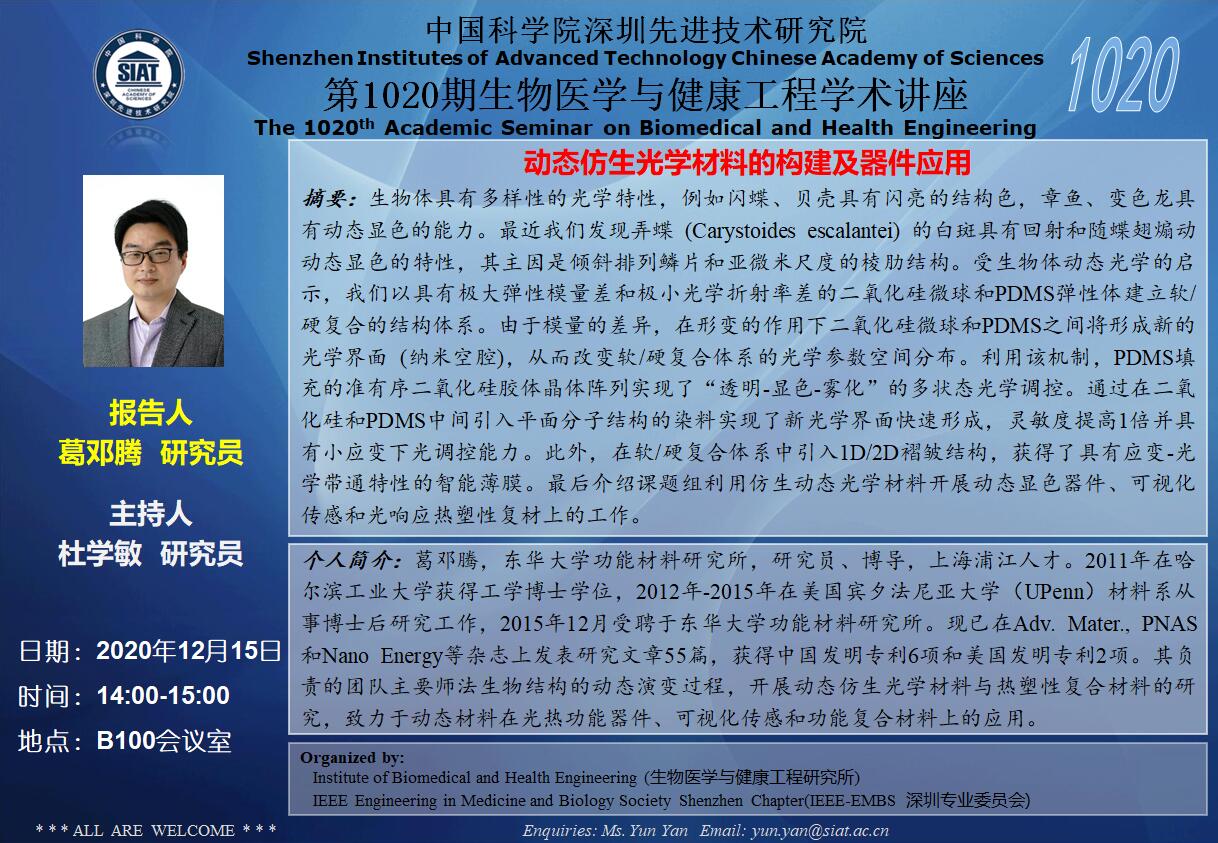 大家好!医工所将于2020年12月15日(周二)下午14:00-15:00,在B100会议室举办第1020期生物医学与健康工程学术讲座,特邀 东华大学 葛邓腾研究员 作题为“动态仿生光学材料的构建及器件应用”的学术报告。诚挚邀请大家参加学习和交流!
