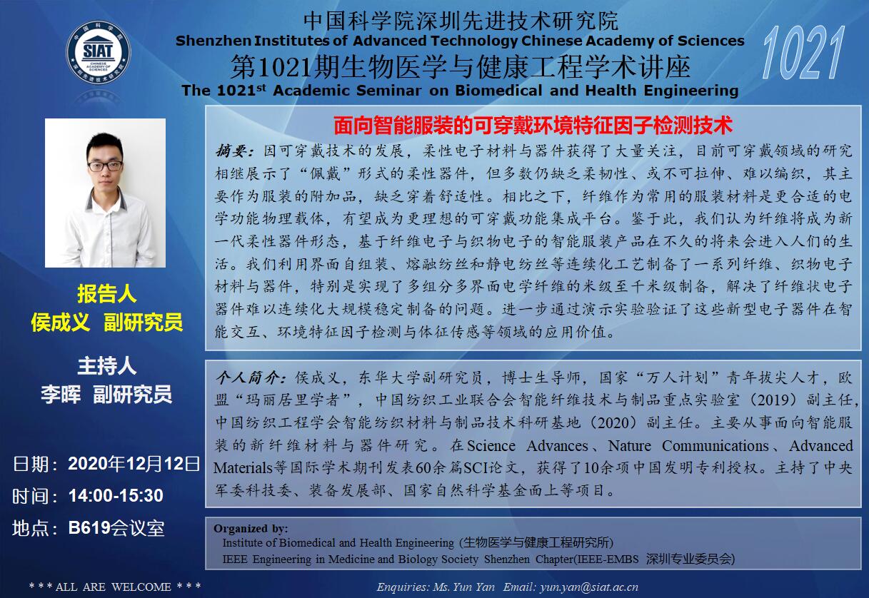 大家好!医工所将于2020年12月12日(周六)下午14:00-15:30,在B619会议室举办第1021期生物医学与健康工程学术讲座,特邀 东华大学 侯成义 副研究员 作题为“面向智能服装的可穿戴环境特征因子检测技术”的学术报告。诚挚邀请大家参加学习和交流!