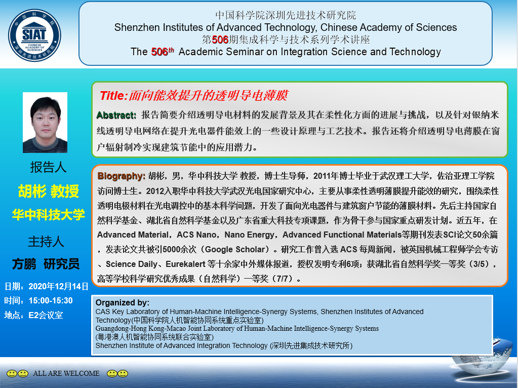 集成所第506期集成科学与技术系列学术讲座将于12月14日(周一)下午15:00-15:30在E2会议室召开。本次讲座特邀华中科技大学的胡彬教授作题为《面向能效提升的透明导电薄膜》的学术报告。