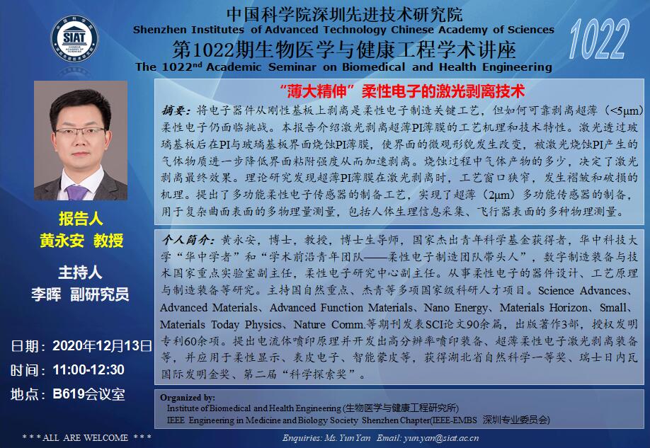 大家好!医工所将于2020年12月13日(周日)上午11:00-12:30,在B619会议室举办第1022期生物医学与健康工程学术讲座,特邀 华中科技大学 黄永安 教授 作题为“‘薄大精深’柔性电子的激光剥离技术”的学术报告。诚挚邀请大家参加学习和交流!