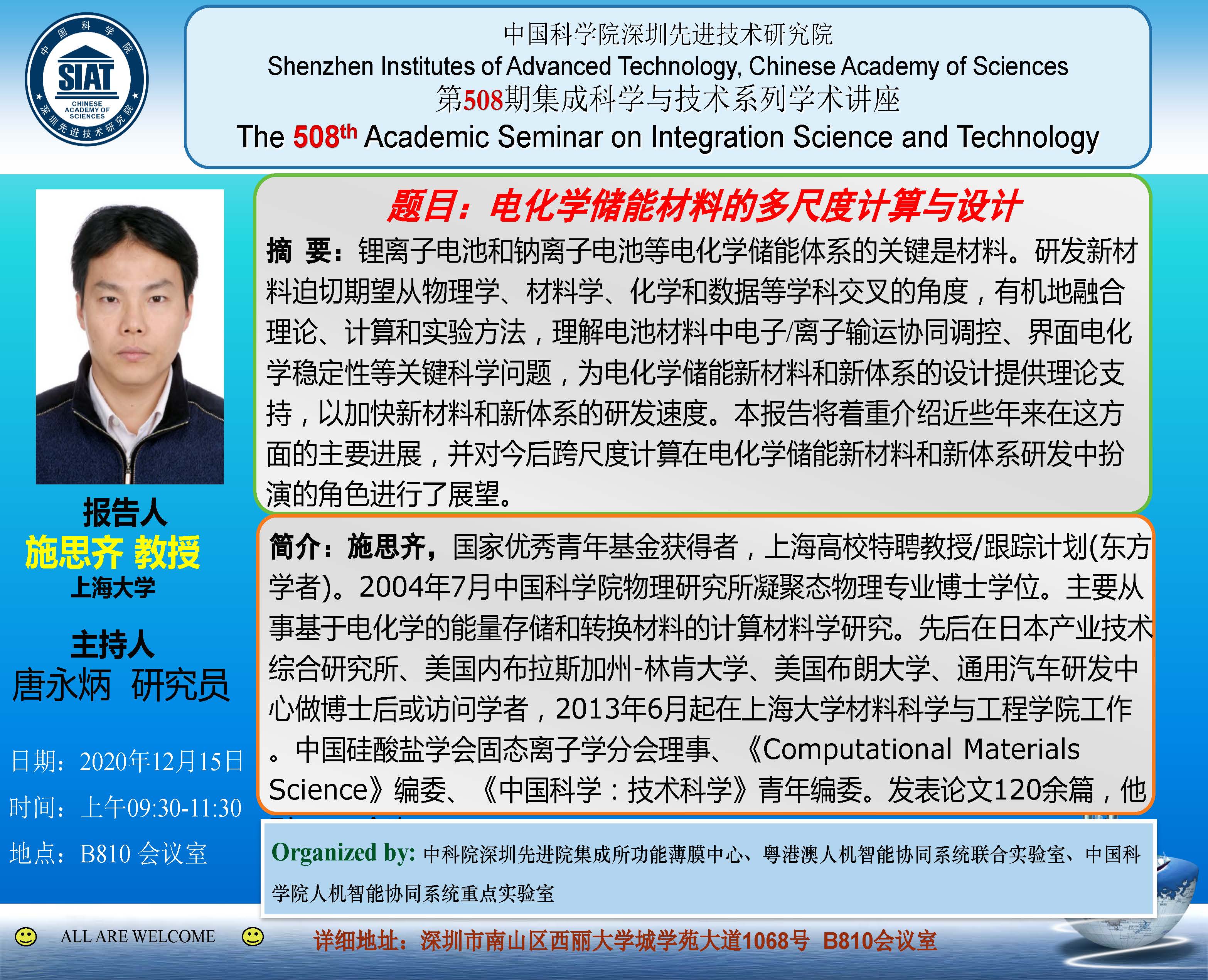 集成所第508期集成科学与技术系列学术讲座将于12月15日(周二)上午09:30-11:30在B810会议室召开。本次讲座特邀上海大学的施思齐教授作题为《电化学储能材料的多尺度计算与设计》的学术报告