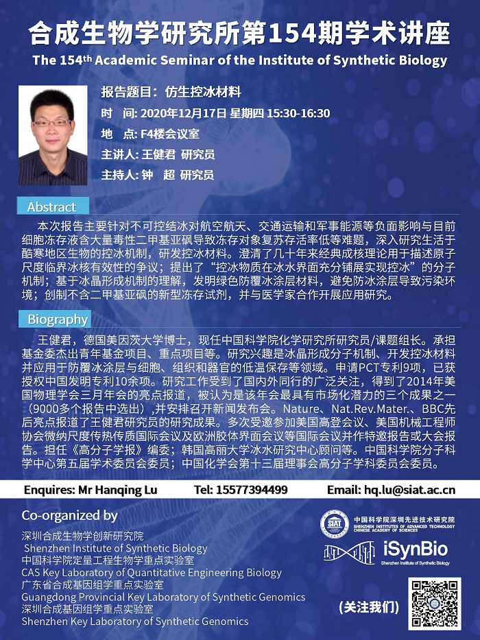本次讲座邀请了 中国科学院化学研究所 王健君 研究员 带来题为“仿生控冰材料”的报告。