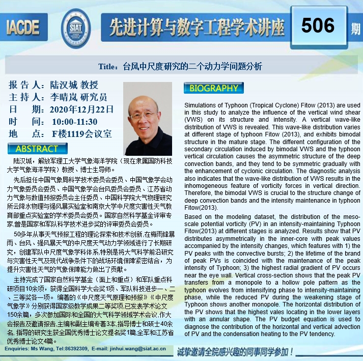 大家好!先进计算与数字工程学术讲座第506期将于12月22日 10:00-11:30在F栋1119会议室举行,本次讲座将邀请解放军理工大学气象海洋学院 陆汉城 教授作题为“台风中尺度研究的二个动力学问题分析”的报告。本次报告将由数字所李晴岚 研究员主持,诚挚邀请大家参加、学习和交流!