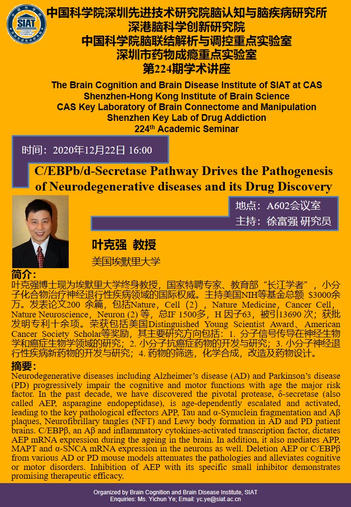 本次讲座由美国埃默里大学,叶克强教授做题为“C/EBPb/d-Secretase Pathway Drives the Pathogenesis of