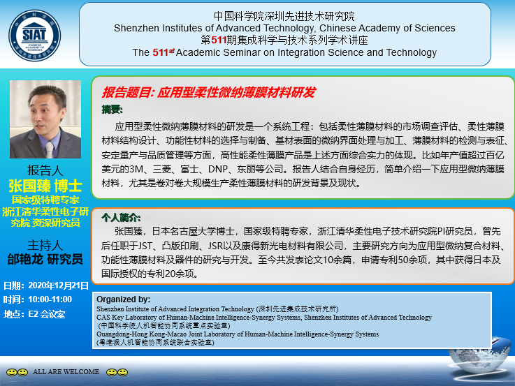 集成所第511期集成科学与技术系列学术讲座将于12月21日(周一)上午10:00-11:00在E2会议室召开。本次讲座特邀浙江清华柔性电子研究院的张国臻博士作题为《应用型柔性微纳薄膜材料研发》的学术报告。