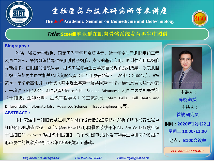 医药所第360期学术讲座将于2020年12月22日 星期二 10:00-11:00在先进院 B100会议室举行。本次讲座邀请了来自浙江大学,陈晓,教授带来“Scx+细胞亚群在肌肉骨骼系统发育再生中图谱”的报告。届时,管敏 研究员将主持讲座。