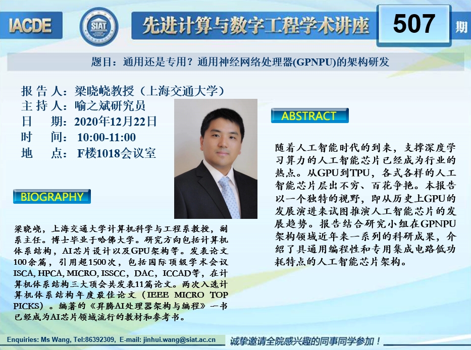 大家好!先进计算与数字工程学术讲座第507期将于12月22日 10:00-11:00在F栋1018会议室举行,本次讲座将邀请上海交通大学 梁晓峣 教授作题为“通用还是专用?通用神经网络处理器(GPNPU)的架构研发”的报告。本次报告将由数字所喻之斌 研究员主持,诚挚邀请大家参加、学习和交流!