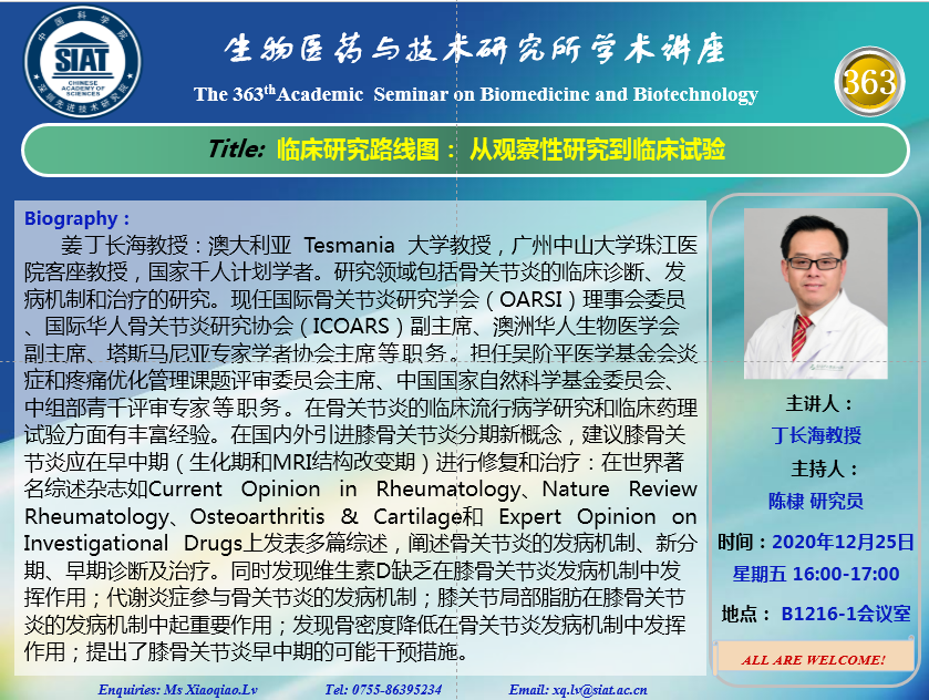 医药所第363期学术讲座将于2020年12月25日 星期五 16:00-17:00在先进院 B1216-1会议室举行。本次讲座邀请了来自澳大利亚 Tesmania 大学,丁长海 教授带来“临床研究路线图: 从观察性研究到临床试验”的报告。届时,陈棣 研究员将主持讲座。