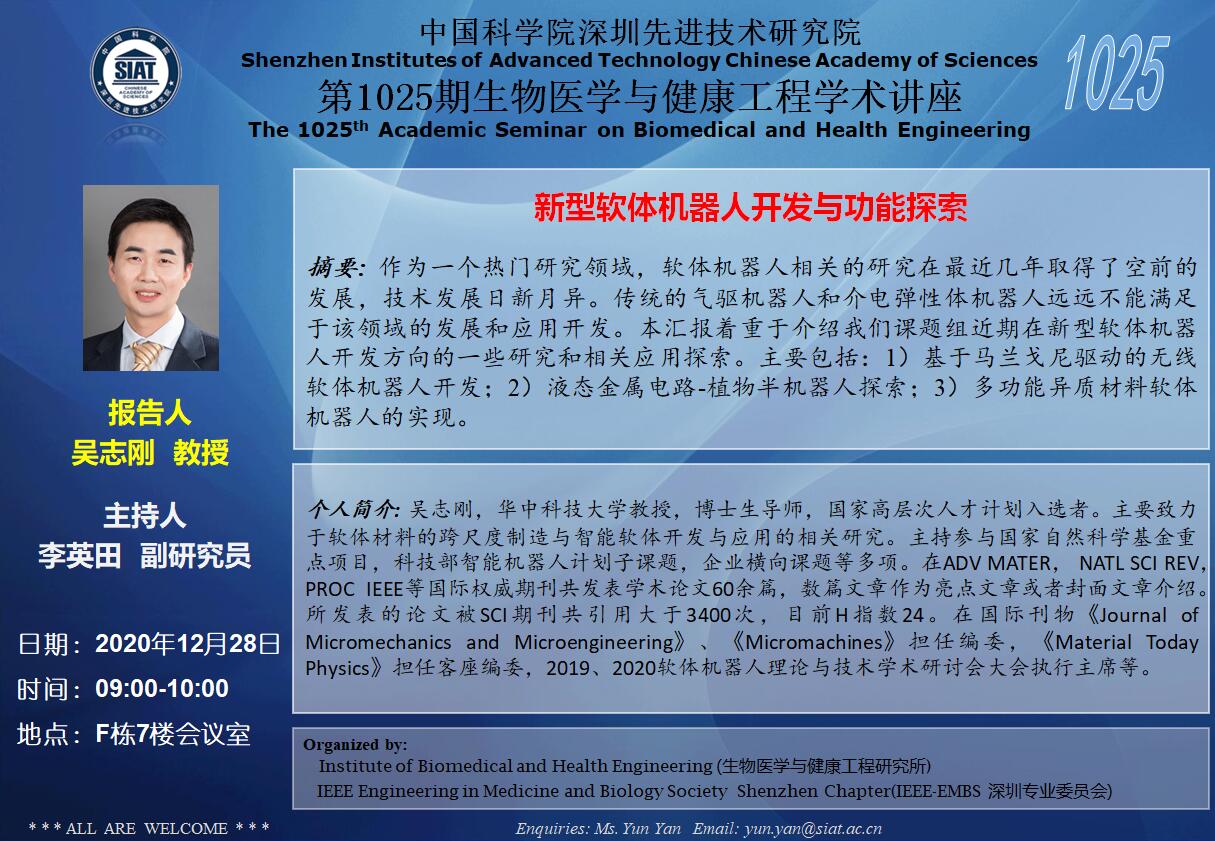 大家好!医工所将于2020年12月28日(周一)上午09:00-10:00,在F栋7楼会议室举办第1025期生物医学与健康工程学术讲座,特邀 华中科技大学 吴志刚教授 作题为“新型软体机器人开发与功能探索”的学术报告。诚挚邀请大家参加学习和交流!
