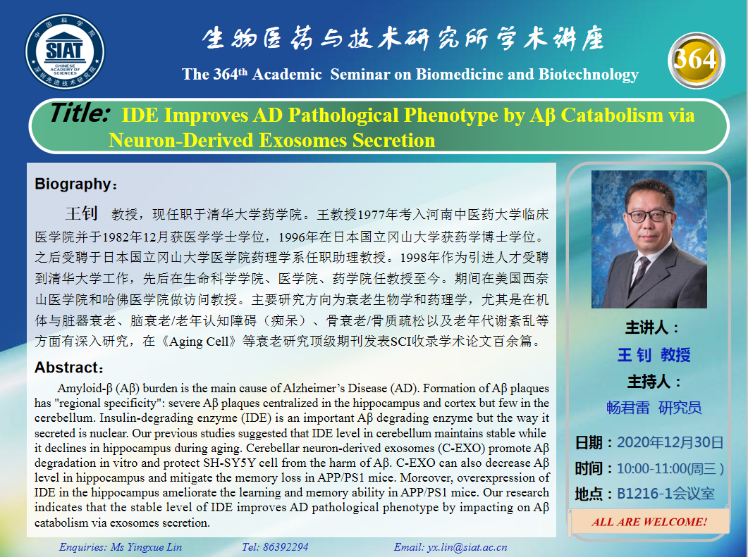 医药所第364期学术讲座将于2020年12月30日 星期三 10:00-11:00 在先进院 B1216-1会议室举行。本次讲座邀请了来自清华大学药学院,王 钊 教授带来“IDE Improves AD Pathological Phenotype by Aβ Catabolism via Neuron-Derived Exosomes Secretion”的报告。届时,畅君雷 研究员将主持讲座。