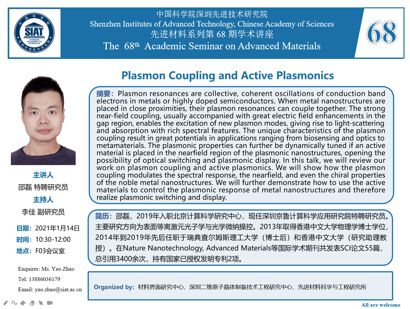 材料所第68期先进材料系列学术讲座将于1月14日(本周四)10:30-12:00在F栋3层会议室召开。本次讲座特邀深圳京鲁计算科学应用研究院 邵磊 研究员 作题为“Plasmon Coupling and Active Plasmonics”的学术报告。