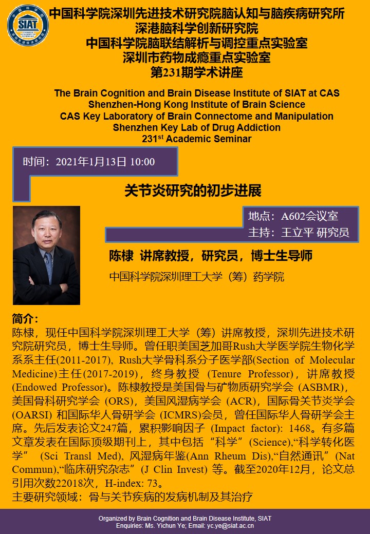 本次讲座由中科院深圳理工大学(筹)药学院,陈棣教授作题为“关节炎研究的初步进展”的 专题报告。