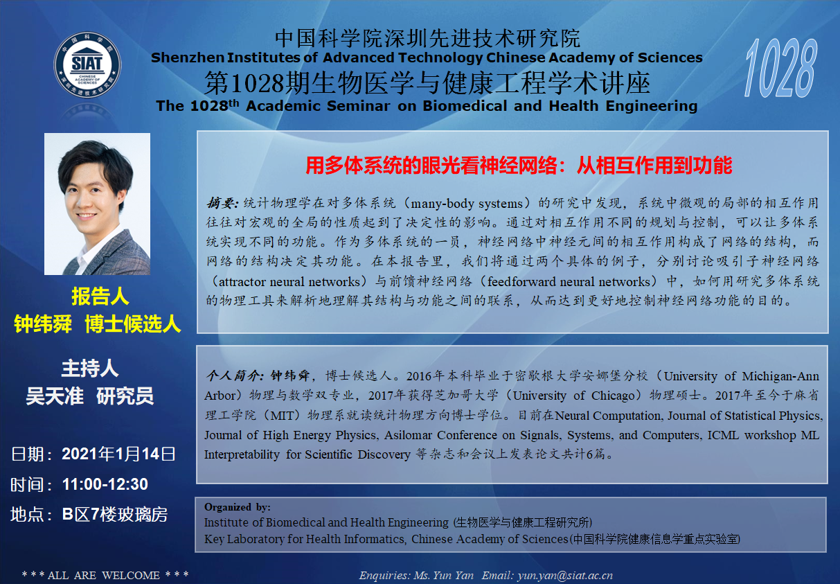大家好!医工所将于2021年1月14日(周四)上午11:00-12:30,在B区7楼玻璃房举办第1028期生物医学与健康工程学术讲座,特邀 麻省理工学院(MIT) 钟纬舜 作题为“用多体系统的眼光看神经网络:从相互作用到功能”的学术报告。诚挚邀请大家参加学习和交流!
