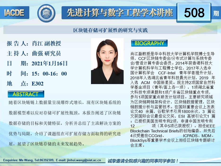 大家好!先进计算与数字工程学术讲座第508期将于1月16日 15:00-16:00在E302举行,本次讲座将邀请华中科技大学 肖江 副教授作题为“区块链存储可扩展性的研究与实践”的报告。本次报告将由数字所曲强 研究员主持,诚挚邀请大家参加、学习和交流!